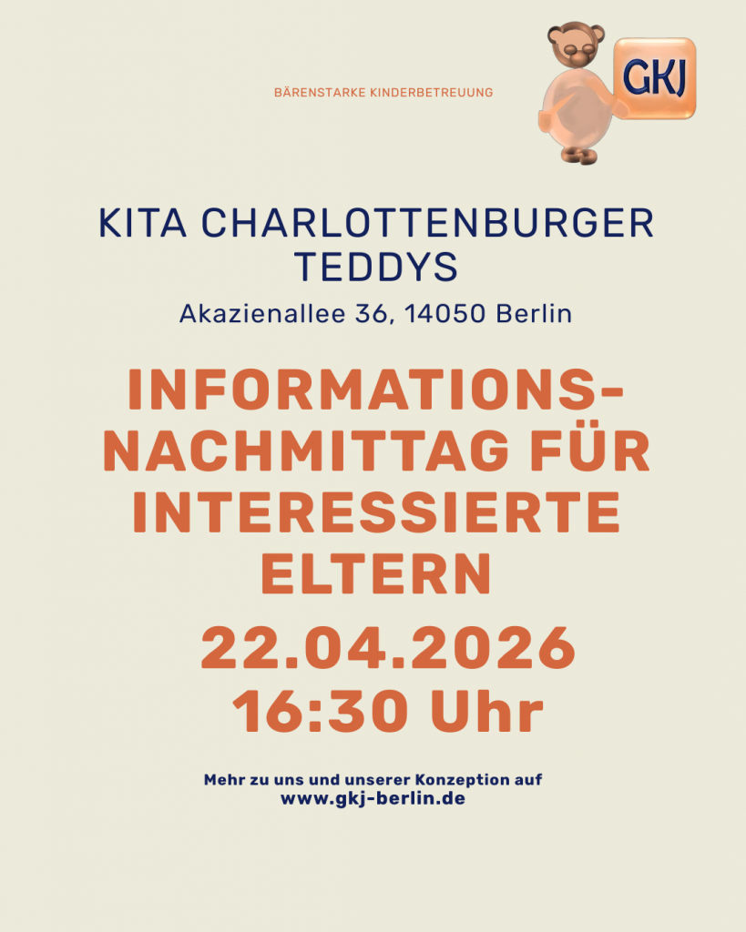 Weitere Informationen zur Einrichtung und zum Konzept finden Interessierte unter https://gkj-berlin.de/kindertagesstaetten/kita-charlottenburger-teddys-akazienallee . Eine Anmeldung für den Nachmittag ist in der Regel nicht zwingend erforderlich, kann aber je nach Nachfrage sinnvoll sein.