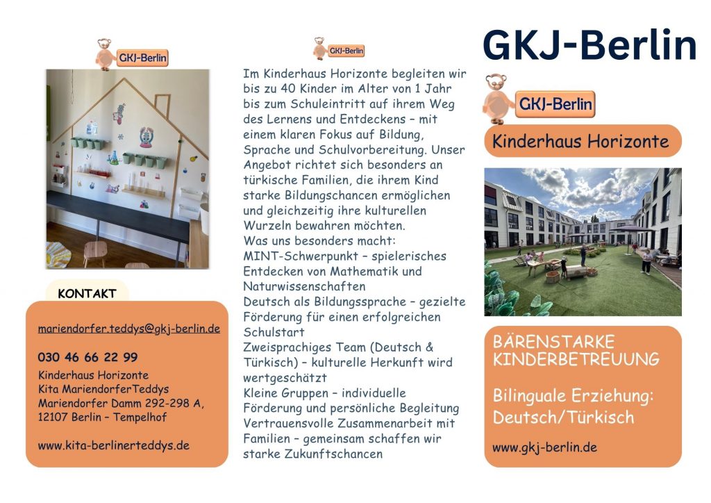 Mit dem Kinderhaus Horizonte entsteht in der Kita Mariendorfer Teddys ein neues, bildungsorientiertes Angebot für Kinder im Alter von 1 bis 6 Jahren, das gezielt auf eine starke Vorbereitung auf die Schule ausgerichtet ist. Zum 01. April 2026 stehen exklusiv 40 Plätze zur Verfügung. Das Kinderhaus richtet sich besonders an deutsch-türkische Familien, die ihrem Kind beste Bildungschancen ermöglichen und gleichzeitig ihre kulturellen Wurzeln und Sprache bewahren möchten.