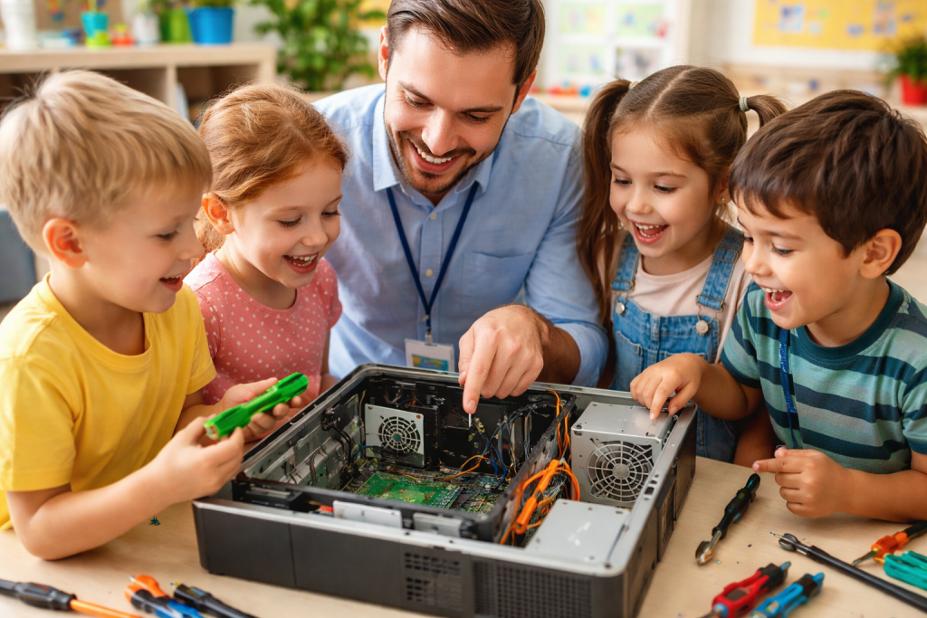 Mit großer Neugier und vielen Fragen versammelten sich unsere kleinen Entdecker um den Tisch. Schritt für Schritt wurde der Computer geöffnet und in seine Einzelteile zerlegt. Dabei konnten die Kinder sehen, was sich eigentlich im Inneren eines Computers verbirgt, von Kabeln über Lüfter bis hin zu kleinen Platinen.